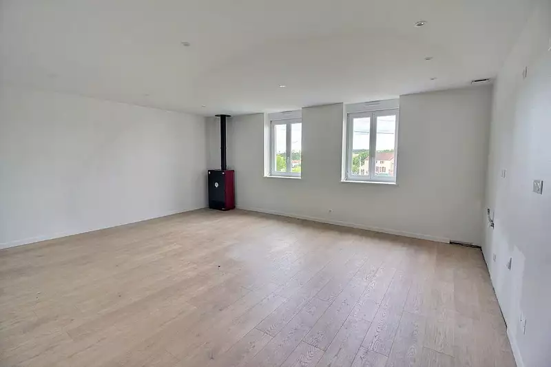 Composé d'un grand séjour avec coin cuisine (vide), de deux chambres et d'une salle de douche, l'appartement propose une surface habitable de 54m², qui pourra être augmentée via la partie en duplex sous les combles à rénover, pour une surface habitable presque doublée. Discussions possibles sur le terrain disponible.