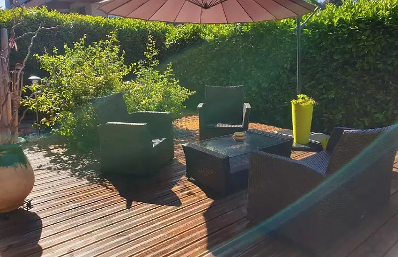 DOUVAINE proche centre et transports pour Geneve., , Coup de coeur pour cet appartement T2 tres lumineux, d'une surface habitable d'environ 55m2, d'un joli jardin avec terrasse d'environ 30m2, la terrasse est une veritable piece a vivre supplementaire des les beaux jours exposee sud., , Entree, cuisine ouverte sur coin repas, un salon dans la veranda qui s'ouvre sur la terrasse et le jardin, un cellier/buanderie, un bureau, une chambre, salle d'eau, WC., , Une cave et un parking privatif completent le lot.,