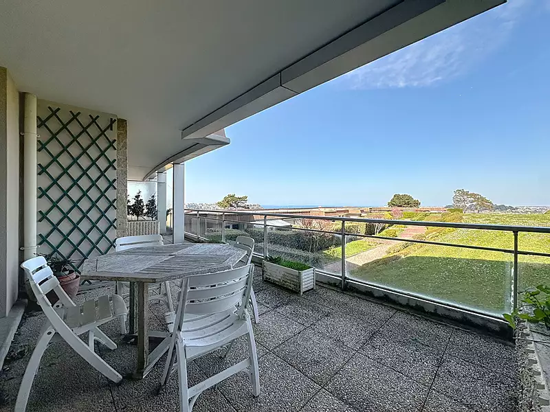 DINARD - APPARTEMENT TYPE 3 - offrant un hall d'entrée, une pièce de vie avec coin cuisine, deux chambres, salle d'eau, WC et une terrasse de 25 m² avec vue sur mer. Un parking en sous-sol. Résidence avec ascenseur. Prix FAI : 445 400 euros dont 4.80 % honoraires TTC à la charge de l'acquéreur. Copropriété de 64 lots - dont 20 lots habitation. (Pas de procédure en cours). Charges annuelles : 1549 euros. Gérald BAGOT (EI) Agent Commercial - Numéro RSAC : 814844403 - SAINT MALO.