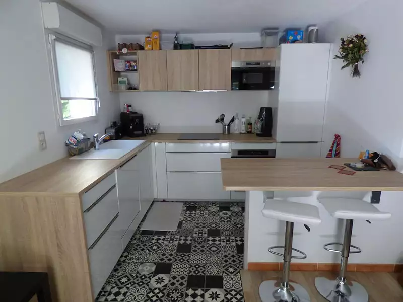 VEDENE, proche centre. Situé au premier étage d'une petite résidence sécurisée, T3 composé comme suit : séjour-cuisine américaine aménagée et équipée, deux chambres, salle de bains, wc, placards. Belle terrasse plein ouest, vue colline. Place de parking en sous-sol.