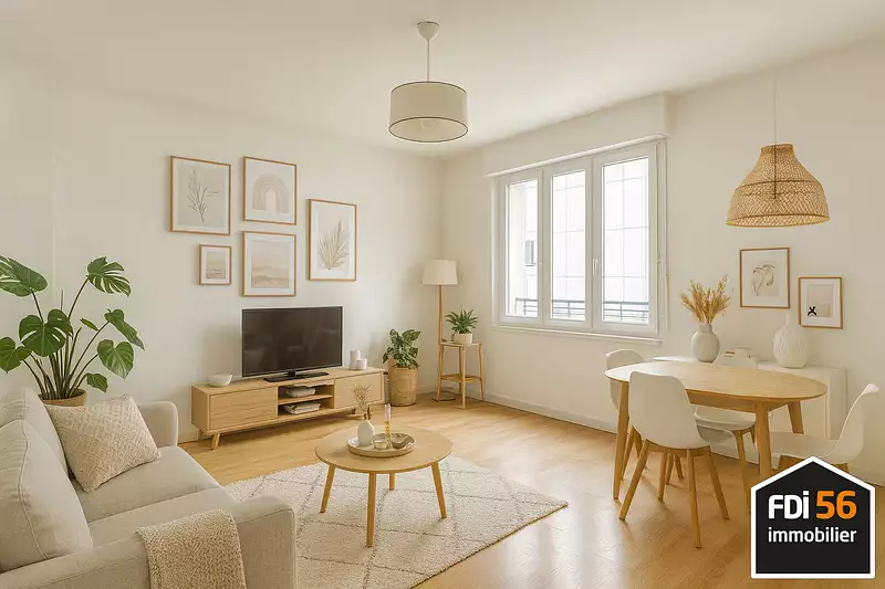 A VENDRE - CENTRE VILLE COMMERCANTS - APPARTEMENT T3 - EXCLUSIVITÉ Découvrez cet appartement de 3 pièces situé au 1er étage d'un immeuble de 3 étages à Lorient. D'une surface de 57 m², cet appartement comprend 2 chambres, un séjour lumineux de 17 m² exposé plein sud, une cuisine indépendante équipée, une salle de bain et un WC. Le chauffage est assuré par des radiateurs au gaz, garantissant un confort optimal. L'appartement est en bon état général, avec des fenêtres en PVC double vitrage et des volets roulants en PVC, offrant ainsi une bonne isolation et un environnement calme. L'extérieur de l'immeuble est bien entretenu et l'assainissement est raccordé au tout à l'égout. Vous bénéficierez également d'une cave pour un espace de rangement supplémentaire. Situé à proximité de divers points d'intérêts tels que des restaurants, des boulangeries, des supermarchés et des pharmacies, cet appartement est idéalement placé pour profiter de la vie urbaine tout en étant dans un cadre paisible. Ne manquez pas cette opportunité, contactez FDI 56 immobilier pour plus d'informations et pour organiser une visite. Certains visuels contenus dans la présente annonce constituent des projections d'aménagement réalisées par intelligence artificielle. Ils ont une vocation exclusivement illustrative et ne sauraient être interprétés comme une représentation fidèle, exhaustive ou contractuelle de l'état actuel du bien. L'aménagement, le mobilier, les matériaux et les volumes figurant sur ces projections sont donnés à titre indicatif et ne sont pas contractuels. bien soumis au statut de la copropriété 4 lots charges annuelles 760 euros prix net vendeur 185 000 euros honoraires charge acquéreur 6,5% "Les informations sur les risques auxquels ce bien est exposé sont disponibles sur le site Géorisques : www.georisques.gouv.fr " (5.41 % honoraires TTC à la charge de l'acquéreur.) Copropriété de 4 lots (Pas de procédure en cours). Charges annuelles : 760 euros. Gery VISTICOT (EI) Agent Commercial - Numéro RSAC : - .
