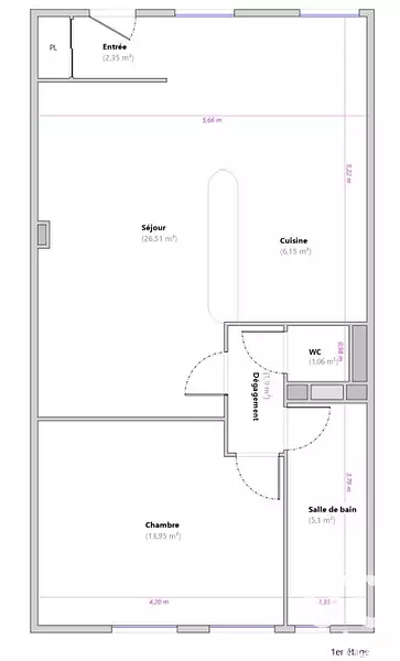 TRAVERSANT EST-OUEST, il comprend une entrée avec rangements, une cuisine équipée avec bar dinatoire ouverte sur le séjour de 33m² et ses 2M90 DE HAUTEUR SOUS PLAFOND, une chambre spacieuse de 14m² avec placards, une salle de bain et un w.c séparé (véritable).