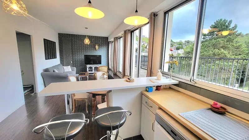 Salon-Séjour lumineux (larges baies vitrées) de 29 m² avec Cuisine A/E open et bar, donnant sur terrasse, grande chambre de 17 m² avec accès terrasse, Salle de Bains et WC séparé.