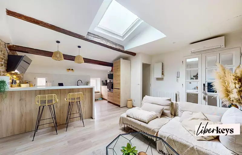 Poussez la porte de cet appartement de 58m² et découvrez une belle pièce de vie, baignée de lumière, où le mur en pierre et les poutres apparentes donnent le ton: Ici le charme de l'ancien rencontre la modernité.
