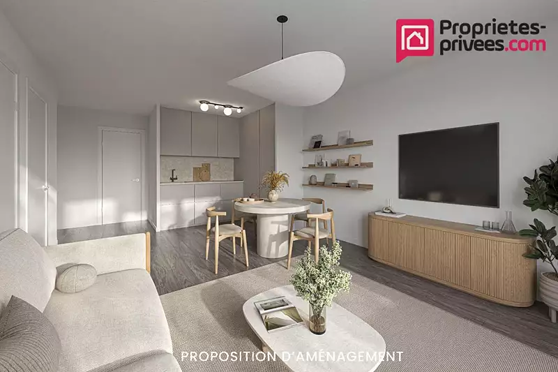 Appartement 3 pièces situé au 1er étage proposant: Entrée, séjour avec cuisine ouverte et accès terrasse.