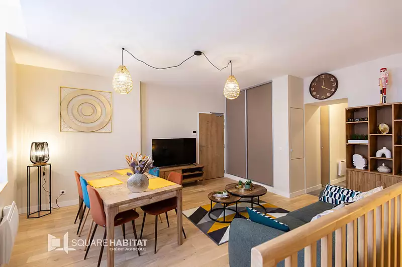 Dans un programme immobilier de standing avec ASCENSEUR, idéalement situé en centre-ville de Cauterets, dans une rue calme , duplex d'environ 58.57m2 loi "Carrez" . Il comprend une entrée desservant une vaste pièce de vie, une cuisine équipée et aménagée et un wc séparé. Au niveau inférieur : deux chambres avec placard, une salle d'eau et un wc séparé. Excellentes prestations, et, emplacement très recherché pour cet appartement. Cave privative en sous-sol. Possibilité de stationnement gratuit devant l'immeuble.