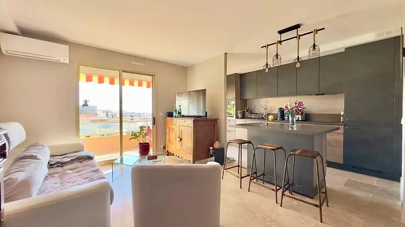 L’entrée avec placard mène à une pièce de vie lumineuse avec cuisine semi-ouverte, ouvrant sur une terrasse de 10 m² exposée plein ciel, offrant une vue panoramique sur la mer et la ville. Un emplacement unique pour profiter des feux d’artifice depuis chez vous.