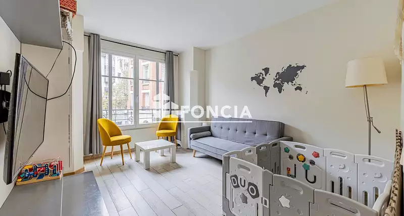 Il offre un bel espace de vie lumineux, une grande cuisine dînatoire entièrement équipée, et deux chambres au calme sur cour, dont une actuellement aménagée en chambre bébé.