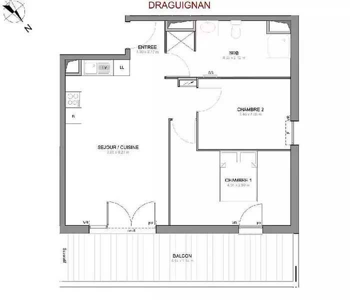 D’une surface d’environ 59 m² environ, il se compose d’une entrée, d’un séjour lumineux avec cuisine ouverte, de deux chambres, ainsi que d'une salle d’eau avec toilette.