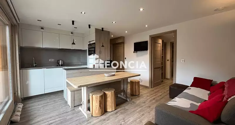 Une pièce de vie chaleureuse, avec cuisine hautement équipée et espace salon/salle à manger ouvrant sur un balcon orienté forêt, véritable tableau vivant au fil des saisons,