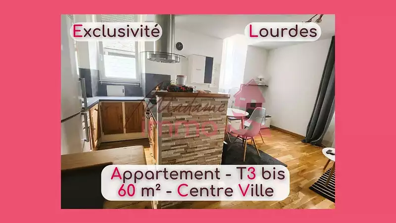 LOURDES, quartier de la Poste - En EXCLUSIVITÉ chez Madame Immo - Appartement T3 Bis rénové de 60m². Vous disposerez d'un Séjour / Cuisine semi équipée, une chambre avec placard, une chambre d'enfant, un bureau, une mezzanine coin nuit et une salle d'eau (douche italienne) avec WC. Situé en RdC surélevé d'une petite résidence, calme. Faibles charges.