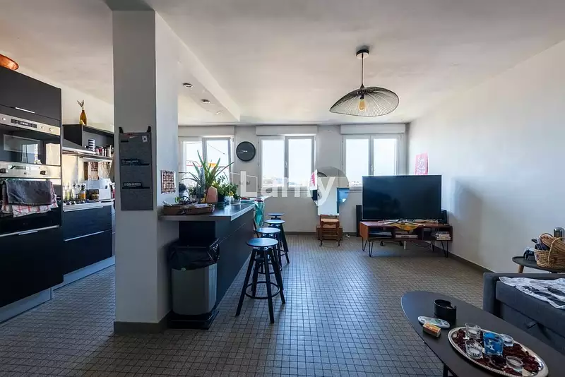 13005 - Proche Timone - Chemin de l'armée d'Afrique. Dans immeuble semi récent avec ascenseur, au 7ème étage, magnifique appartement traversant de type 3 avec vue dégagée de part et d'autre. Il se compose d'une très belle pièce principale avec cuisine us équipée de 34 m², une salle d'eau, 2 chambres avec rangement orientées sur l'arrière ainsi qu'un balcon de 1,63m² ; l'ensemble est harmonieux et entièrement refait. Le DPE est bien classé en B. Le chauffage est individuel au gaz. Charges de copropriété de 129 €/mois (dont 33€ d'eau froide incluse). Taxe foncière de 963€.Le dernier compte rendu d'AG ne présente pas de gros travaux de copropriété à prévoir.