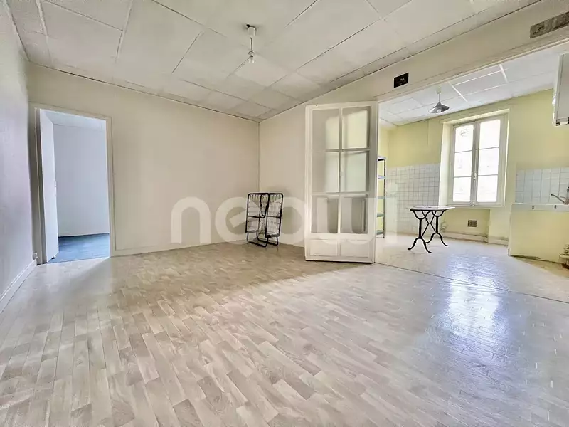 RIOM, EXCLUSIVITE, au deuxième étage d’une copropriété située rue du Commerce, appartement de type 3 d’une superficie « Loi Carrez » de 59,56 m2, il dispose d’une entrée donnant sur une cuisine ouverte sur l’espace de vie, deux chambres, une salle de bains et un WC séparé. Il est possible d’abattre la cloison entre le séjour et une chambre afin de profiter d’un volume de vie de 27 m2. L’appartement est alimenté au gaz de ville. Des travaux intérieurs seront à prévoir : mise aux normes de l’électricité, isolation et rafraichissement intérieur.