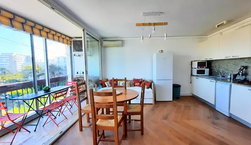 Lumineux et spacieux, il a été entièrement rénové. Il se compose d'un grand hall d’entrée avec placard, une pièce à vivre avec cuisine ouverte donnant sur une loggia fermée avec petite vue mer, deux chambres avec placards, une salle d'eau avec douche à italienne et coin buanderie, WC indépendant.