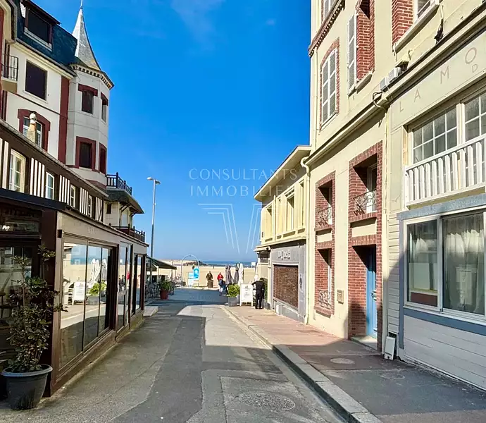 A 50m de la plage, des tennis et du centre de Trouville sur mer, spacieux appartement de 3 pièces, il se compose au RDC d'un salon et sa cuisine dinatoire, une chambre & salle de douche et toilettes, à l'étage un palier desservant une salle de bain et une chambre.