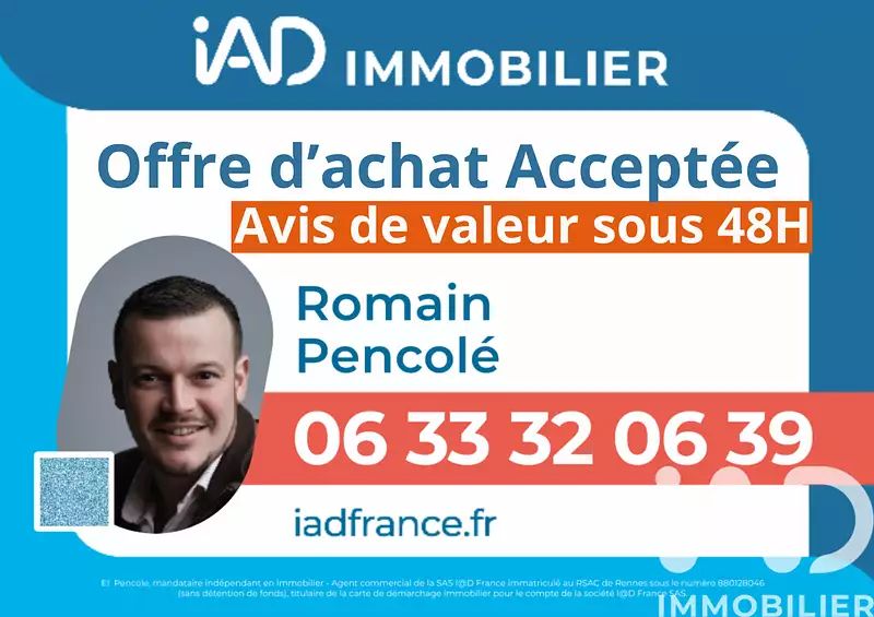 La présente annonce immobilière a été rédigée sous la responsabilité éditoriale de M Romain Pencolé mandataire indépendant en immobilier (sans détention de fonds), agent commercial de la SAS I@D France immatriculé au RSAC de Rennes sous le numéro 880128046, titulaire de la carte de démarchage immobilier pour le compte de la société I@D France SAS.