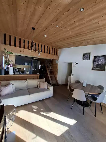 Au 1er étage avec accès extérieur et indépendant de la copropriété ; Une entrée donnant accès à la salle de bain et au wc indépendant. S'offre ensuite à vous un superbe espace de vie cosy et lumineux avec cuisine ouverte, coin repas et salon avec poêle à bois ; ainsi qu'au balcon plutôt bien ensoleillé situé côté parking. Au dessus, espace mezzanine 'ouvert' (hors loi carrez), aménageable selon besoin (rangements, salle de jeux, bureau, chambre d'appoint..). L'espace nuit se compose de 2 chambres donnant également côté parking, au même niveau que la pièce de vie.