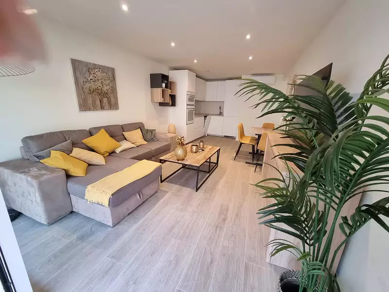 JUAN LES PINS CENTRE VILLE Magnifique trois pièces traversant, complétement rénové et décoré par architecte, situé en étage élevé d'une résidence sécurisée et avec accès PMR