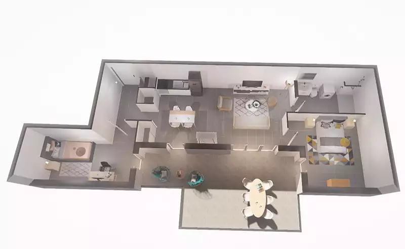 Dès l’entrée, vous serez séduit par la première chambre qui donne directement sur la terrasse, un vrai coin de sérénité. À gauche, le séjour avec cuisine ouverte s’ouvre également sur l’extérieur, créant un espace convivial et chaleureux.