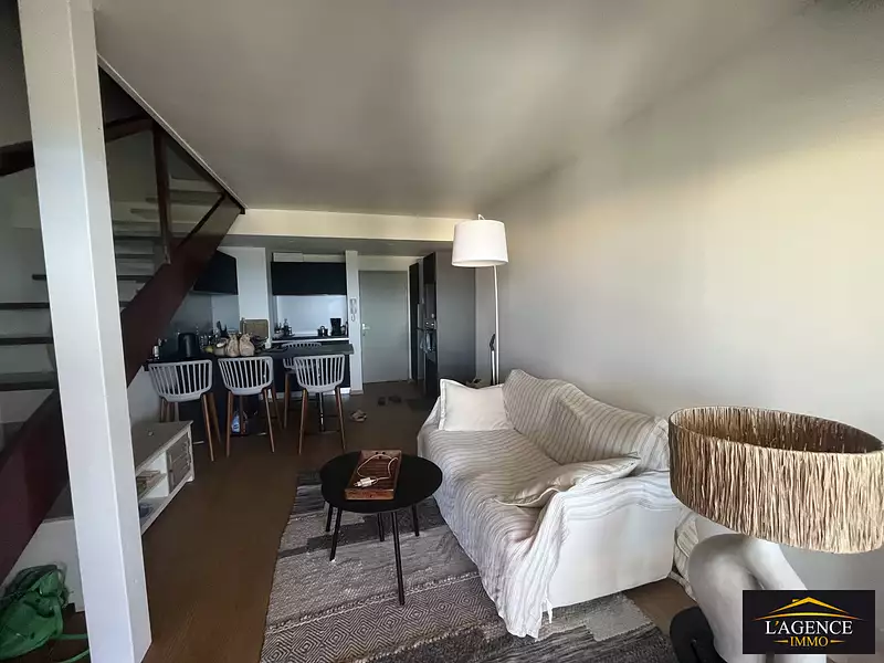 Au dernier étage, appartement de type F2 + bureau, ce duplex est composé d'une entrée sur un séjour/cuisine prolongé par une terrasse couverte bénéficiant d'une jolie vue sur la mer.