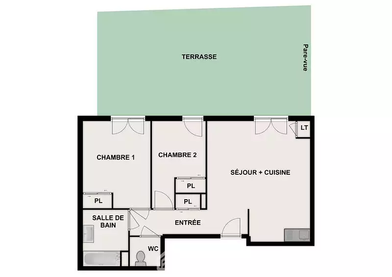 Entrée avec placard, cuisine/séjour avec accès à une grande terrasse, 2 chambres avec placard, salle de bains, WC et 2 places de parking privatives.