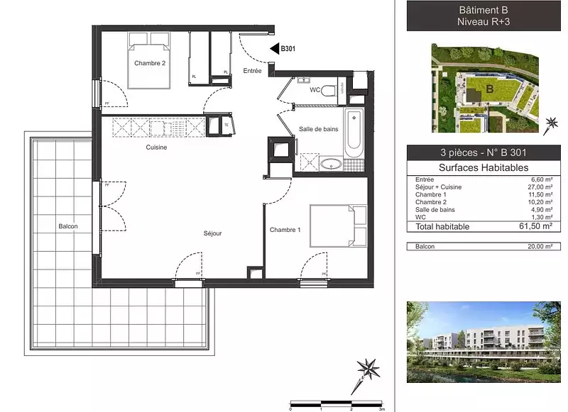 | 61,5 m² - 3 pièces - 2 chambres | Étage 3/4 avec ascenseur |