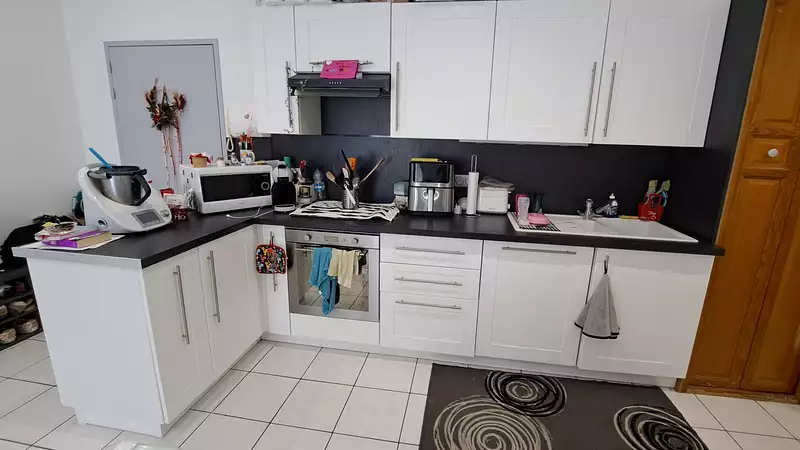 Distribution: Grande pièce de vie avec cuisine aménagée et équipée, dégagement avec placard, WC indépendant, salle d'eau avec espace buanderie et 2 grandes chambres de 11 et 13 m².