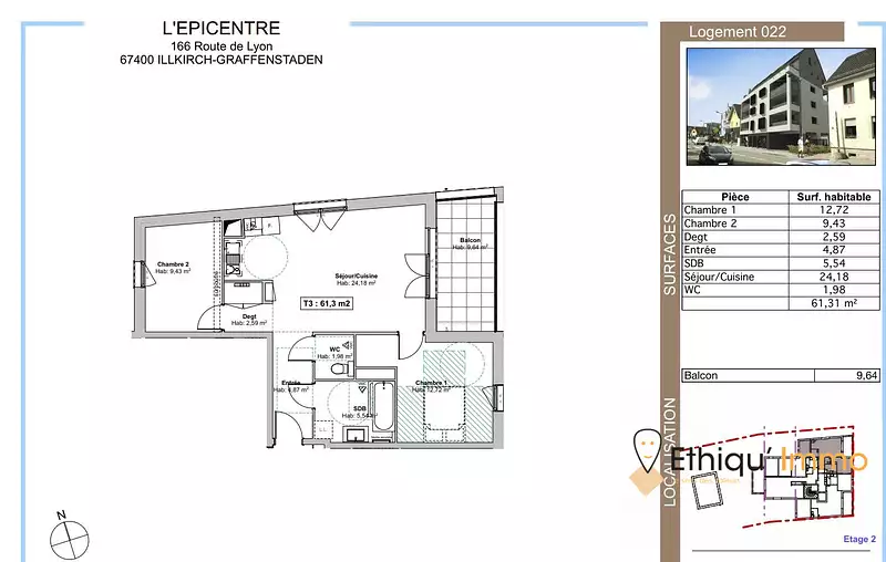 | 61,31 m² - 3 pièces - 2 chambres | Étage 2/5 avec ascenseur |