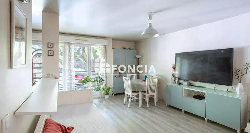 L'appartement s'ouvre sur une entrée qui permet d'accéder à la partie jour et la partie nuit. Dans la partie jour, un séjour de 21 mètres carrés ouvert sur une cuisine de 7 mètres carrés.