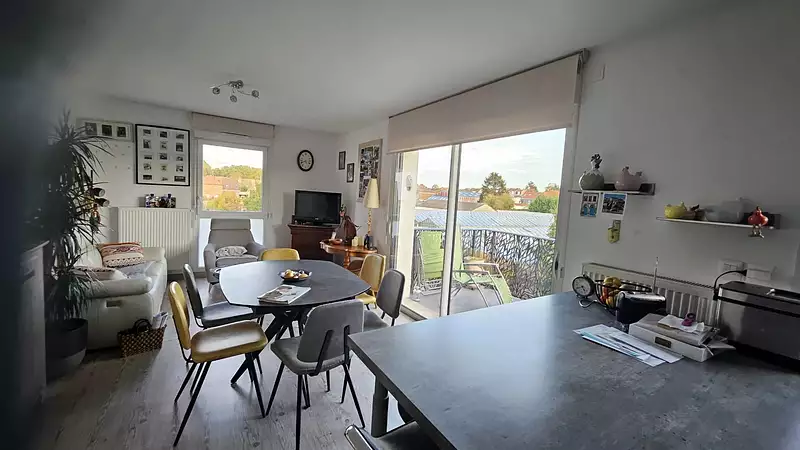 LIMITE NEUVILLE EN FERRAIN , tres bel appartement de type 3 construit en 2013 d'une surface de 61 m2 au 2 ème étage d'une petite copropriété . Séjour avec cuisine équipée lumineux , 2 chambres , cellier , salle de bains avec baignoire , balcon de 9 M2 exposé SUD et un garage.