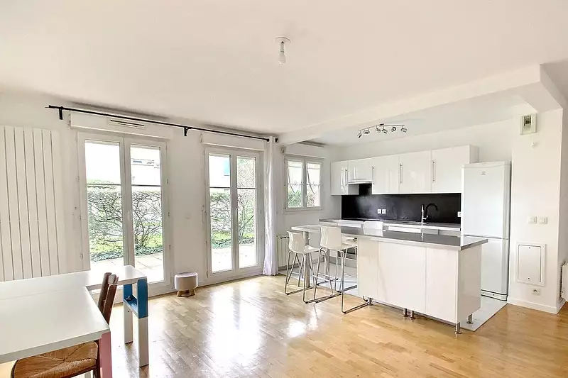 Séjour lumineux ouvert sur une cuisine moderne et équipée, bénéficiant d'un accès direct à la terrasse