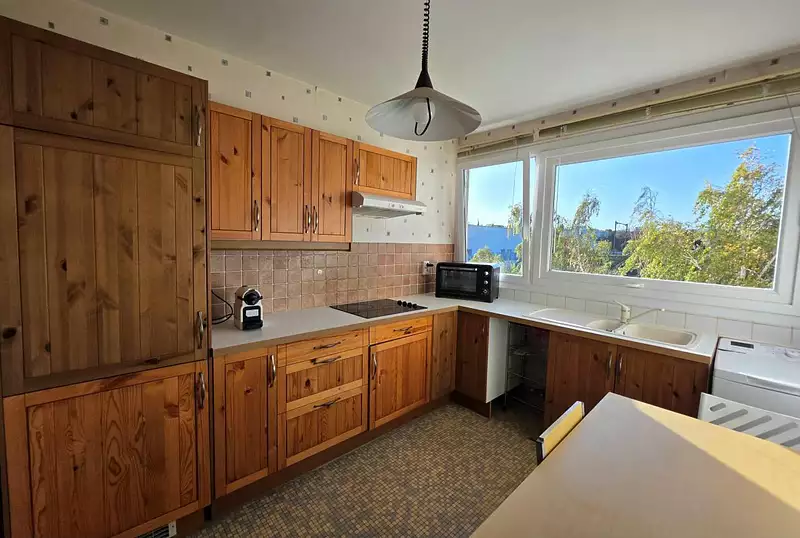 ARPAJON, appartement lumineux T2 (possibilité T3) de 62m² au 4ème étage d'une résidence sécurisée avec ascenseur comprenant : une entrée avec rangements, une cuisine aménagée, un séjour de 28 m² très lumineux (possibilité d'y créer une 2ème chambre) donnant sur un balcon de 4m², une chambre avec rangements, une salle d'eau et un WC indépendant.