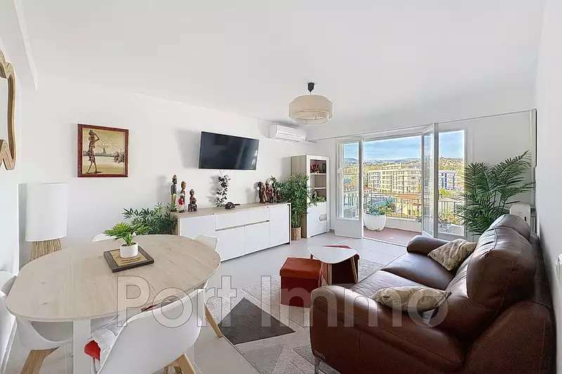 EXCLUSIVITE : SECTEUR MARECHAL JUIN PROCHE HIPPODROME, DERNIER ÉTAGE, TOUTES COMMODITES BUS et MER A PIED, copropriété résidentielle et sécurisée, appartement TRAVERSANT aux prestations contemporaines, exposition Nord/Sud de 3 pièces 62.54m² balcon 11.70m² plus terrasse 7.40m², composé : d'un spacieux hall d'entrée, séjour, cuisine indépendante (possibilité US), deux chambres d'env. 12 & 13m², salle de douche à l'italienne, wc indépendant. BELLE VUE sur le Haut de Cagnes arrière-pays Cagnois, CALME, climatisation, vendu avec une cave de 4m², parkings collectifs dans la résidence. RENSEIGNEMENT ET VISITE : ARMELLE GUICHAOUA 06.64.63.07.74