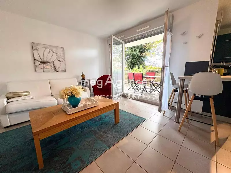 L'agréable séjour s'ouvre sur une terrasse couverte sans vis-à-vis, prolongée par un jardin ombragé, idéal pour profiter des beaux jours en toute tranquillité. La cuisine entièrement équipée s'intègre harmonieusement au séjour, offrant un cadre convivial et fonctionnel.