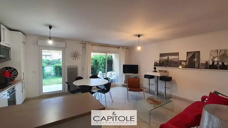 Juan les Pins - Plages et commerces à pied, magnifique appartement 3 pièces avec terrasse et jardin, dans un domaine très recherché avec piscine, au calme, vendu avec un garage.