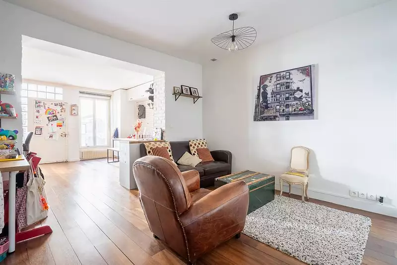 PARIS XVIII - Rue Marcadet - A moins de 5 minutes à pied de la station de métro Lamarck-Caulaincourt et à proximité des commerces et parcs, venez découvrir ce joli trois pièces. Composé d'une entrée, d'une belle cuisine ouverte sur la salle à manger, d'un espace salon en second jour, d'une grande chambre, d'une chambre enfant, d'une salle de bains et de toilettes indépendants. Un appartement de caractère avec un beau parquet, au calme absolu disposant d'une bonne notation énergétique : entièrement isolé par l'intérieur, double vitrage, chauffage et eau chaude alimentée avec une chaudière individuelle gaz. Les chambres disposent de trois grandes fenêtres de toit apportant une grande clarté. Un cabanon complète le bien.