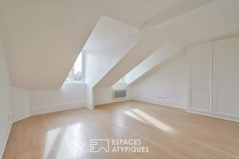Ce lumineux appartement de 62 m² au sol (43 m² carrez) a pris place au dernier étage d'un immeuble ancien sur le plateau de Saint Germain en Laye, à seulement 5 min à pied du RER A, et de la place du marché. L'entrée éclairée par un velux dessert à droite, le salon/salle à manger joliment mansardé qui développe 15 m² carrez (21 m² au sol) et profite d'un grand placard de rangement, ainsi que la chambre de 13 m² carrez, (14 m² au sol) au parquet pin massif. A gauche, se sont installées, la salle de bains puis la cuisine de 7 m² (13 m² au sol) avec son placard de rangement. Cet agréable appartement à l'emplacement prémium, au dernier étage d'un immeuble ancien bénéficie d'une jolie vue dégagée exposition sud/ouest. Un grenier de 2,30 m² situé sur le palier complète les prestations de ce bien. Un jardin commun, un local à vélo sont à disposition des copropriétaires, pour profiter d'un espace verdoyant en coeur de ville. RER A, Tram 13 à 5 min à pied, CLASSE ENERGIE : E / CLASSE CLIMAT : B. Montant moyen estimé des dépenses annuelles d'énergie pour un usage standard, établi à partir des prix de l'énergie de l'année 2021 : entre 770 et 1.080 euros Copropriété de 19 lots dont 10 lots d'habitation. Charges de copropriété en création, aucune procédure en cours. Local à vélo. Contact : Sophie 07 61 00 52 78 RSAC Versailles 832 411 144 Copropriété de 19 lots - dont 10 lots habitation. (Pas de procédure en cours). Charges annuelles : 1279 euros. Sophie STANDERA (EI) Agent Commercial - Numéro RSAC : 832411144 - Paris.