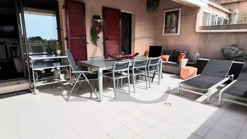 1 entrée avec placard sur cuisine semi-équipée ouverte et séjour - 2 Belles chambres avec chacune sa salle de douche/wc. Terrasse ensoleillée 36m2-