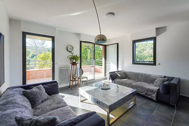 ERA PONT DE L'ARC vous propose à la vente ce magnifique appartement T3 de 63 m², situé au 2e et dernier étage avec ascenseur d'une résidence récente, fermée et sécurisée, très recherchée du quartier du Pont de l'Arc à Aix-en-Provence, sans nuisances. Idéalement situé à proximité des commerces, des écoles (Nativité), des transports et des axes routiers, il offre un cadre de vie calme et agréable. L'entrée avec rangements dessert un séjour lumineux avec cuisine ouverte, deux chambres pourvues de placards aménagés, une salle d'eau équipée de branchements lave-linge et sèche-linge, ainsi que des WC séparés. La terrasse de 22 m², exposée plein Sud et sans vis-à-vis, accessible depuis le séjour et une chambre, constitue un bel espace extérieur pour profiter du soleil en toute tranquillité. L'ensemble est en excellent état général et particulièrement lumineux. Une place de stationnement privative complète ce bien ; l'acquisition d'un garage fermé en sous-sol est possible en supplément. Annonce rédigée par Vincent MOUSTIER (Tél. : 06 59 68 13 80) Agent commercial (EI) - R.S.A.C. Aix-en-Provence 983 324 377 Copropriété de 190 lots - dont 63 lots habitation. (Pas de procédure en cours). Charges annuelles : 1550 euros.