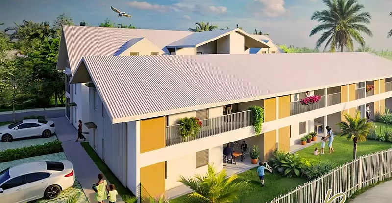 Les logements bénéficient de varangues spacieuses habillées de claustras, favorisant l'ombrage et la ventilation traversante est-ouest grâce aux alizés.
