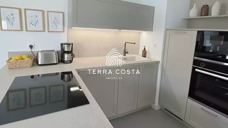 Le séjour-cuisine accueille une cuisine aménagée et équipée aux lignes soignées.