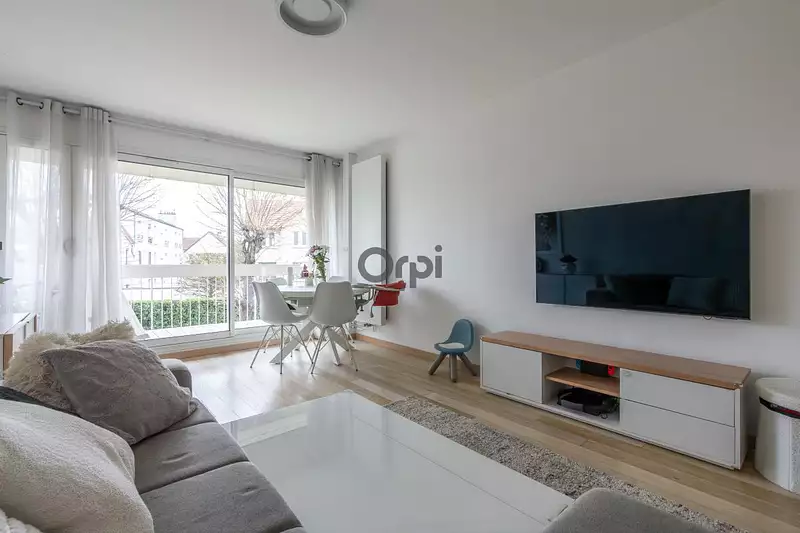 Il est situé proche du centre-ville et des écoles, à 15 minutes à pieds du RER A. L'espace de « vie » bénéficie d'une entrée avec placards, un séjour sur balcon offrant une agréable vue ainsi qu'une cuisine indépendante aménagée et équipée. L'espace « nuit » offre quant à lui deux chambres et une salle de douche. Une cave et un stationnement privé complètent ce bien.