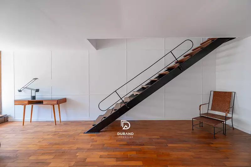 Le célèbre escalier créé par Jean Prouvé structure l’espace avec élégance et relie les deux niveaux selon une dynamique architecturale qui a fait la réputation de ces appartements en duplex. L’ensemble compose un lieu de vie à la fois fonctionnel, chaleureux et profondément inscrit dans l’histoire du modernisme.