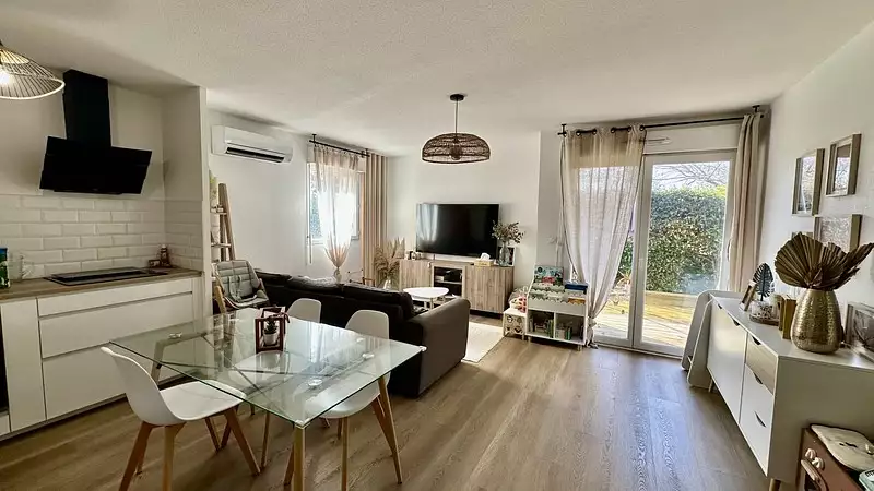 Situé au rez-de-chaussée d'une petite résidence de seulement un étage, cet appartement entièrement rénové avec goût offre une surface habitable de 63 m² et un confort optimal.