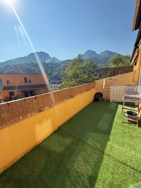 Sur la commune de Menton, proche de l'A8, de l'intermarché, de l'école, exposition sud-ouest, au calme, vue dégagée, 3 pièces lumineux au 2ème et dernier étage, en exposition sud-ouest, + couchage sur mezzanine de 11 m2 . Cet appartement allie charme et confort dans un quartier familial et paisible , en bon état, il offre un espace de vie chaleureux prolongé par une belle terrasse exposée sud-ouest, parfaite pour des repas en plein air ! Il s'agit d'un appartement composé au niveau 0 d'une entrée, beau séjour lumineux ,cuisine séparée, WC invité, belle terrasse