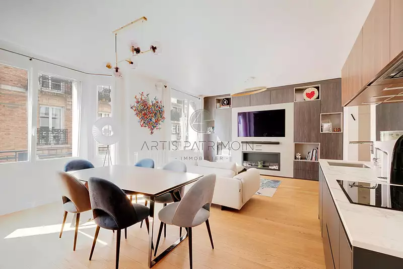 Situé à proximité immédiate de l'avenue des Ternes, dans un quartier dynamique et recherché, Artis Patrimoine vous propose ce superbe appartement de 63 m², au 3? étage d'un immeuble Art Déco très bien entretenu avec ascenseur. Entièrement rénové par un architecte, ce bien lumineux et sans perte d'espace offre une atmosphère chaleureuse et contemporaine. Il se compose d'un magnifique double séjour avec cuisine ouverte aménagée et équipée, d'une chambre parentale avec rangements sur mesure, d'une pièce de 7 m² idéale pour une chambre d'enfant, un bureau ou un espace polyvalent, ainsi que d'une grande salle d'eau et de WC séparés. Un appartement clé en main, parfait pour un couple, une famille ou un pied-à-terre parisien. Une cave complète ce bien. Commerces, transports et écoles à proximité immédiate. (3.81 % honoraires TTC à la charge de l'acquéreur.) Copropriété de 92 lots - dont 84 lots habitation. (Pas de procédure en cours). Charges annuelles : 3840 euros.