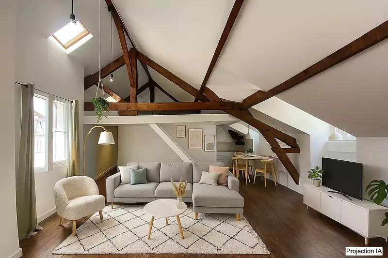 Belle pièce de vie sur parquet avec cuisine A&E ouverte, deux chambres et un bureau (ou 3ème chambre en mezzanine), salle d'eau et wc. Nombreux rangements, cave de 13m2.
