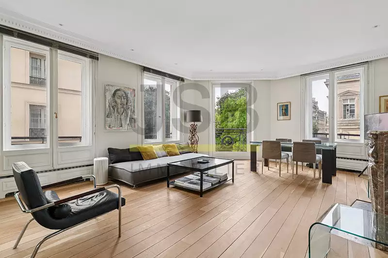 L’appartement, entièrement repensé par un architecte, séduit par son double séjour en angle baigné de lumière, ses 5 fenêtres, sa hauteur sous plafond, son parquet, ses moulures, sa cheminée et sa décoration contemporaine.