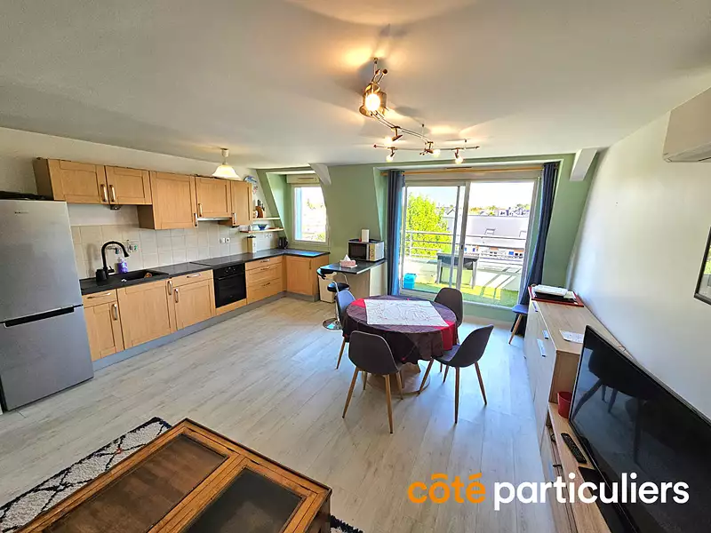 A découvrir sans tarder dans votre agence Côté Particuliers de Plescop : un appartement lumineux et spacieux idéalement situé au coeur du charmant bourg de Plescop, au sein d'une résidence calme et bien entretenue datant de 2005, avec un ravalement de façade réalisé récemment (2022/2023). Situé au 2ème et dernier étage avec ascenseur, cet appartement de type 3 vous séduira par ses volumes et sa luminosité. Il se compose d'une vaste pièce de vie avec cuisine ouverte, aménagée et équipée, donnant sur un balcon. Deux chambres confortables, une salle d'eau moderne avec espace buanderie, ainsi qu'un WC séparé complètent l'espace nuit. Vous apprécierez particulièrement : Une grande terrasse de 25 m² , parfaite pour profiter du soleil et recevoir en toute convivialité. Un second espace extérieur grâce au balcon attenant à la pièce de vie. Un cellier sur le palier pour un rangement pratique et supplémentaire. Un garage privatif fermé et une place de stationnement extérieure. Le confort d'un système de chauffage et climatisation réversible par pompe à chaleur. Un bien rare sur le secteur, alliant confort, fonctionnalité et cadre de vie agréable à deux pas des commodités. A visiter rapidement ! (4.00 % honoraires TTC à la charge de l'acquéreur.) Copropriété de 59 lots - dont 20 lots habitation. (Pas de procédure en cours). Charges annuelles : 1204 euros.