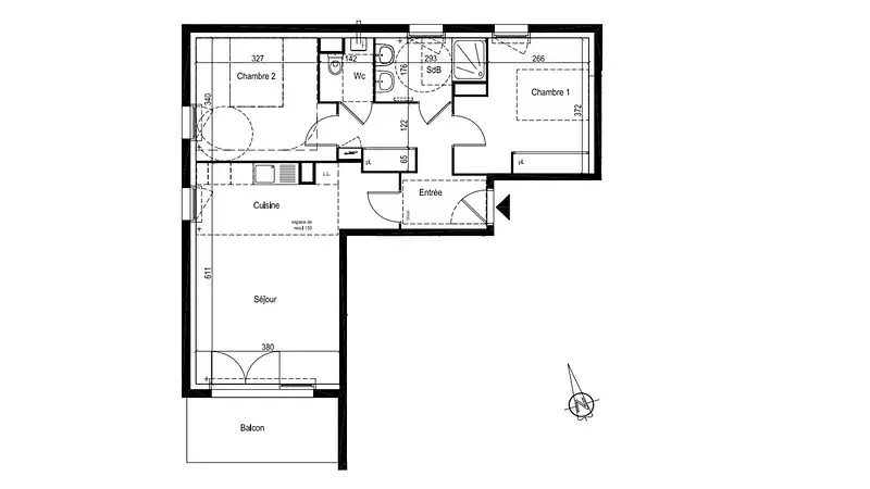 Cet appartement d'environ 64.68m² habitables se compose d'une entrée avec placard, une pièce de vie avec balcon orientés Sud, WC indépendant, 2 chambres et une salle d'eau.